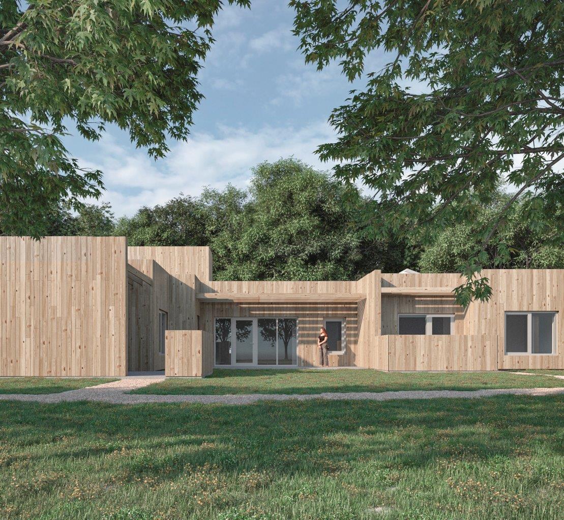 Autismecenter Fredericia skal være et DGNB Guld certificeret byggeri og bliver – på nær de præfabrikerede badeværelser et 100 procent træbyggeri. Facaderne beklædes med resttræ fra produktionen af varmebehandlede profilbrædder. Illustration må frit benyttes ved omtale af projektet og med kredit til Ginneruparkitekter.